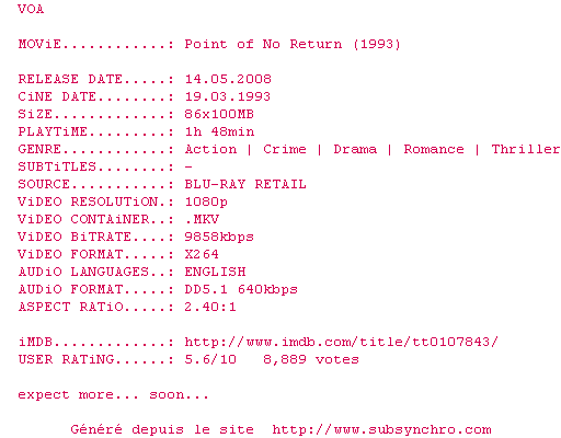 Voir le nfo de la release Point.Of.No.Return.1993.1080p.BluRay.x264-VOA