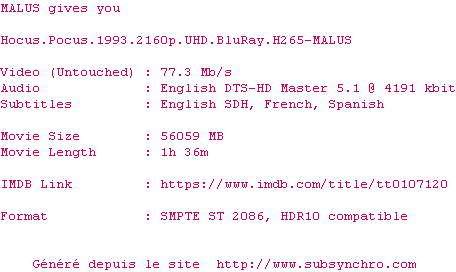 Voir le nfo de la release Hocus.Pocus.1993.2160p.UHD.BluRay.H265-MALUS