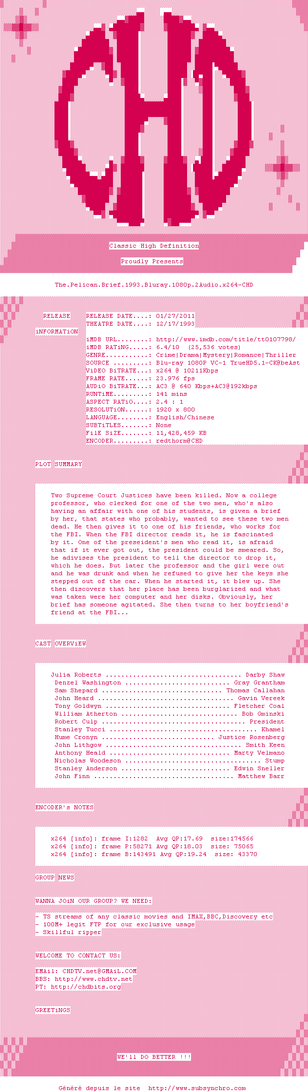 Voir le nfo de la release The.Pelican.Brief.1993.Bluray.1080p.2Audio.x264-CHD