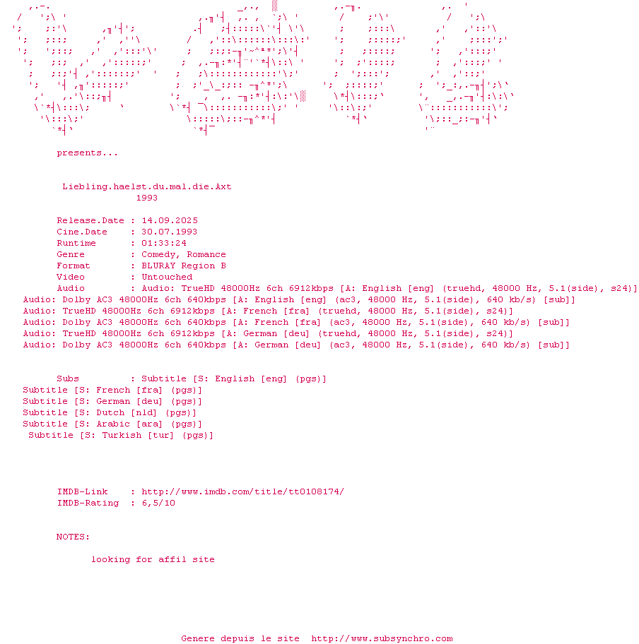 Voir le nfo de la release Liebling.Haelst.Du.Mal.Die.Axt.1993.MULTi.COMPLETE.BLURAY-VEiL
