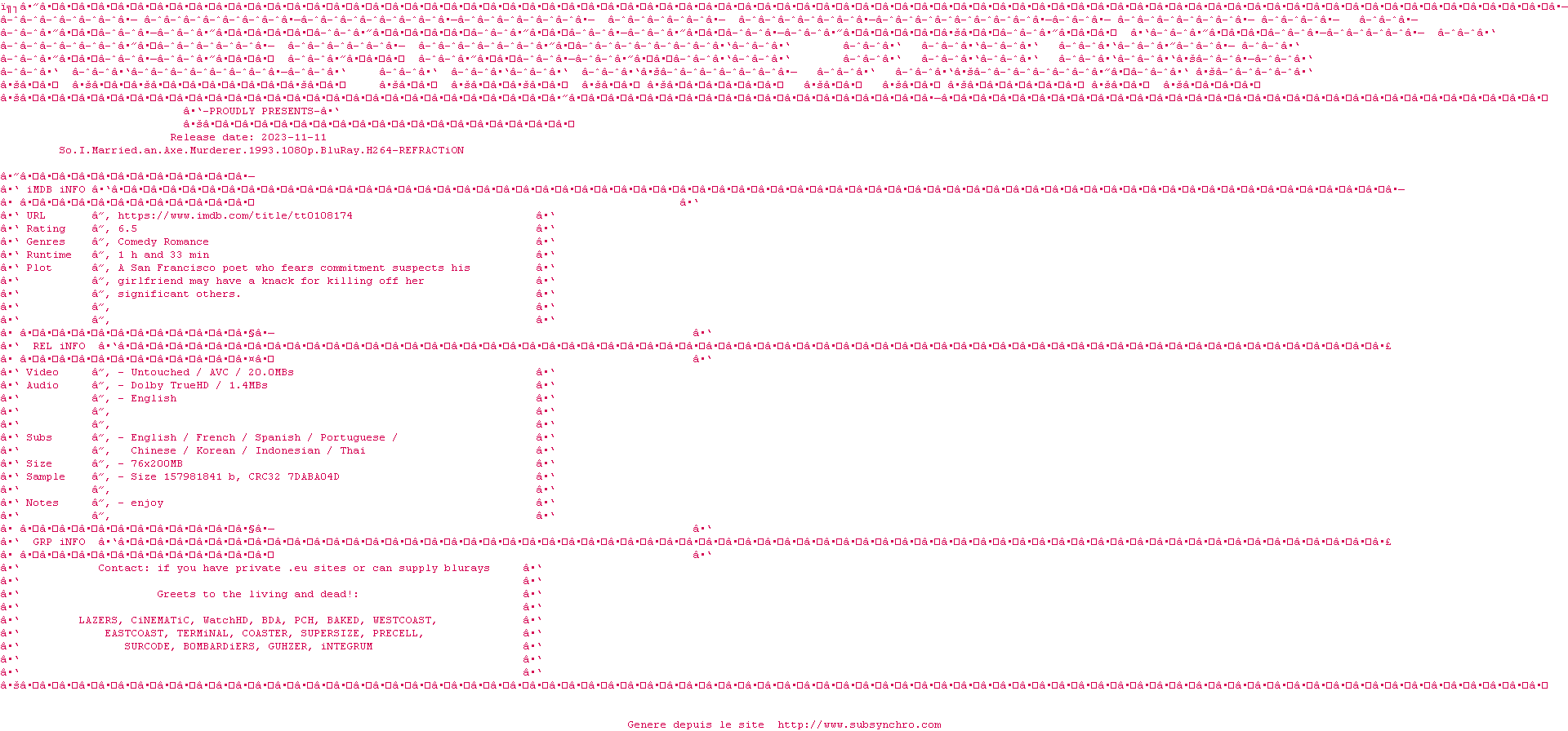 Voir le nfo de la release So.I.Married.An.Axe.Murderer.1993.1080p.BluRay.H264-REFRACTiON