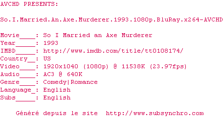 Voir le nfo de la release So.I.Married.An.Axe.Murderer.1993.1080p.BluRay.x264-AVCHD