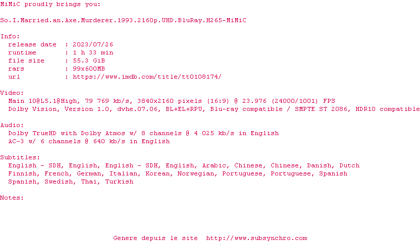Voir le nfo de la release So.I.Married.An.Axe.Murderer.1993.2160p.UHD.BluRay.H265-MiMiC
