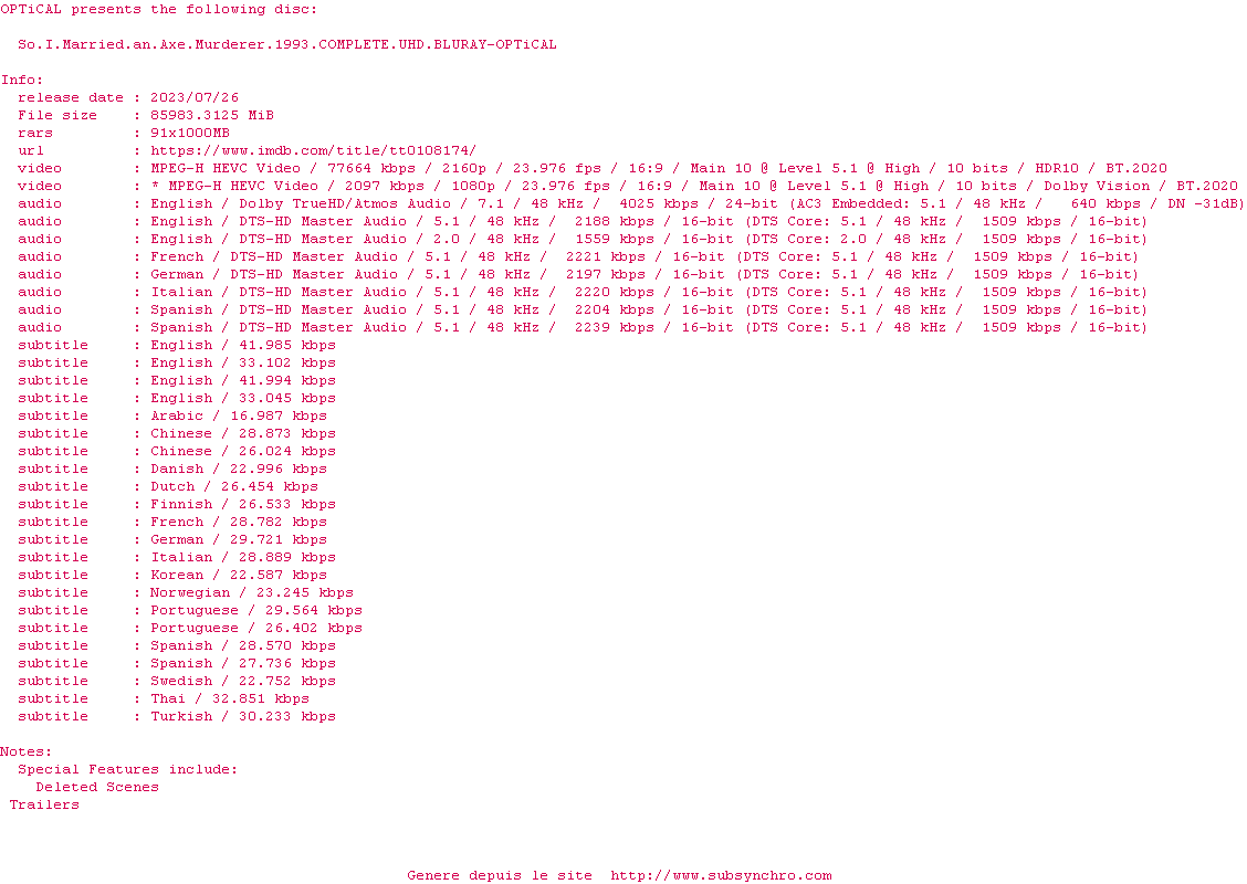 Voir le nfo de la release So.I.Married.An.Axe.Murderer.1993.COMPLETE.UHD.BLURAY-OPTiCAL