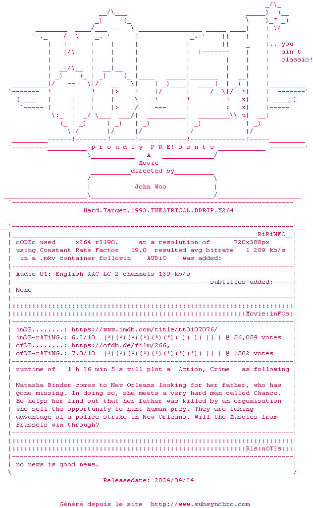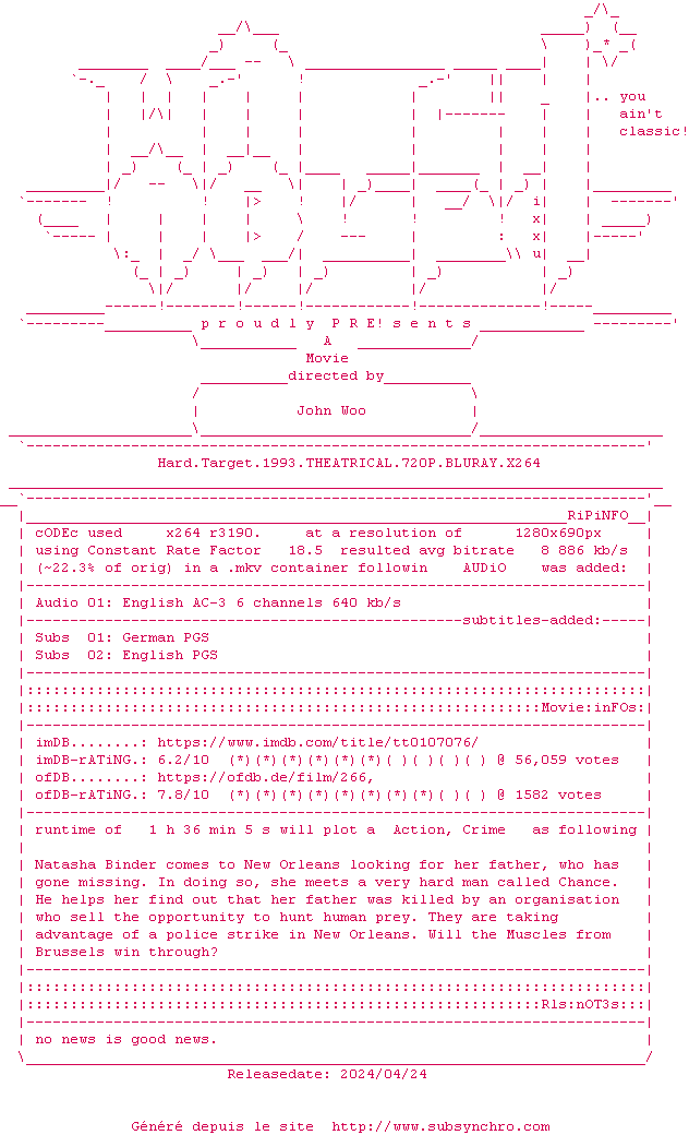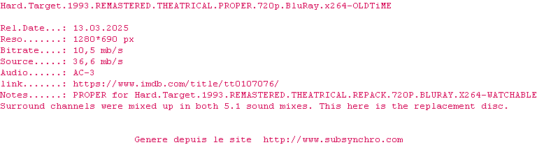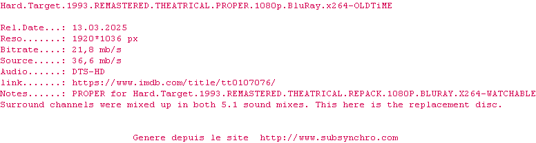 Voir le nfo de la release Hard.Target.1993.REMASTERED.THEATRICAL.PROPER.1080p.BluRay.x264-OLDTiME