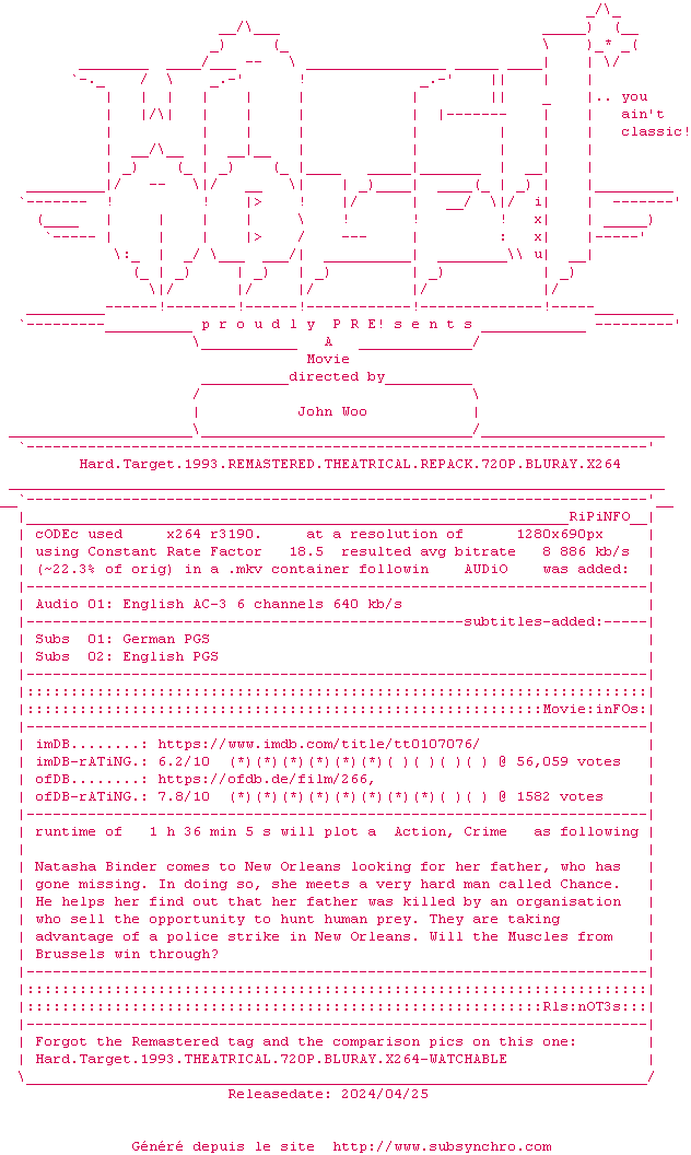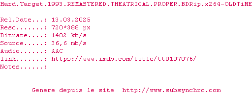 Voir le nfo de la release Hard.Target.1993.REMASTERED.THEATRICAL.REPACK.1080P.BLURAY.x264-WATCHABLE