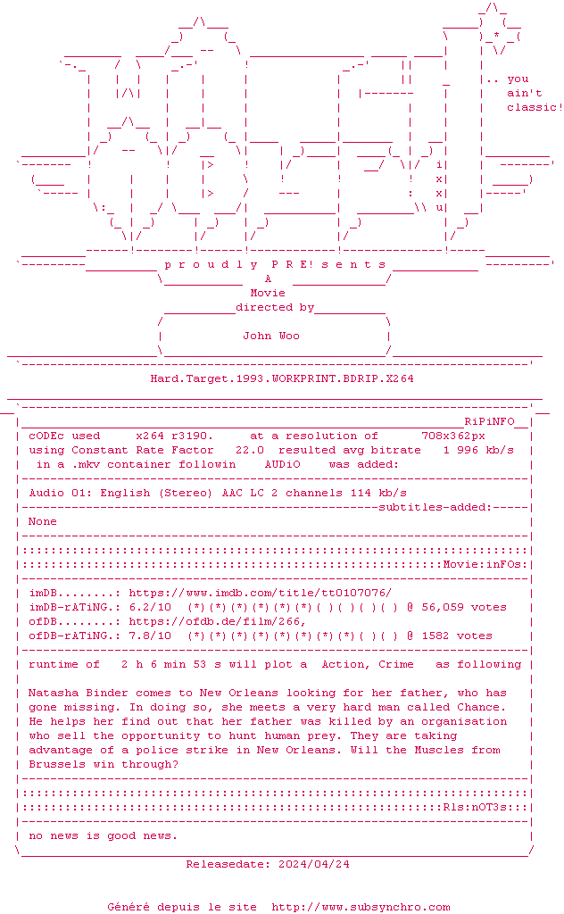 Voir le nfo de la release Hard.Target.1993.WORKPRINT.BDRIP.x264-WATCHABLE
