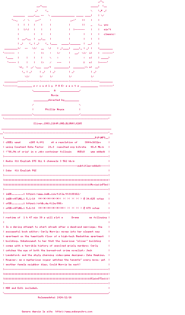Voir le nfo de la release Sliver.1993.2160P.UHD.BLURAY.x265-WATCHABLE