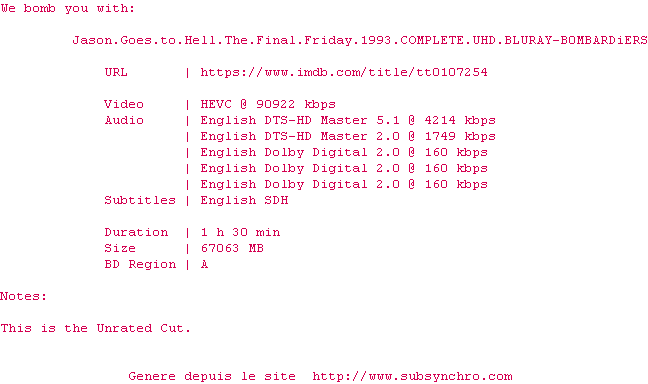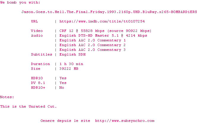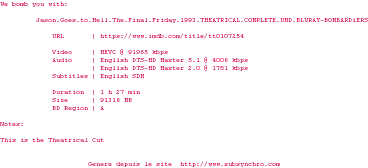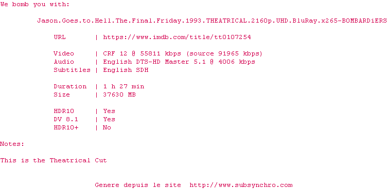 Parmi les personnages ont en a quand même un qui sort du lot (un expert sur Jason) et qui est ainsi mémorable. L'histoire est bizarre et ce n'est plus vraiment un slasher (la franchise avait été rachetée par New Line préalablement ce qui explique les tentatives de chambouler un peu les choses).