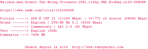 Voir le nfo de la release Wallace.And.Gromit.The.Wrong.Trousers.1993.2160p.UHD.BluRay.H265-SHARD