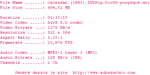 Calendar.1993.Z1.poopface.srt Ajouté par Ultimhate Ajoute le 17-08-2010 02:32:57 Format : SRT Italique : Non Taille : 0.00Ko Telechargement : 55 Ajouter cette release à ma collection en cas de telechargement des sous-titres 0 0 0 Telecharger le ZiP contenant NFO, Affiche, Sous-titre (*.srt) Commentez le fichier Calendar.1993.Z1.poopface.srt Commentez le fichier Calendar.1993.Z1.poopface.srt Commentez ce fichier Le fichier 138-1282005204.srt n'existe pas ! Telechargez le RSS « Fichier de la release Calendar.1993.FS.DVDRip.DivX5-poopface » Retour au film « Calendar »