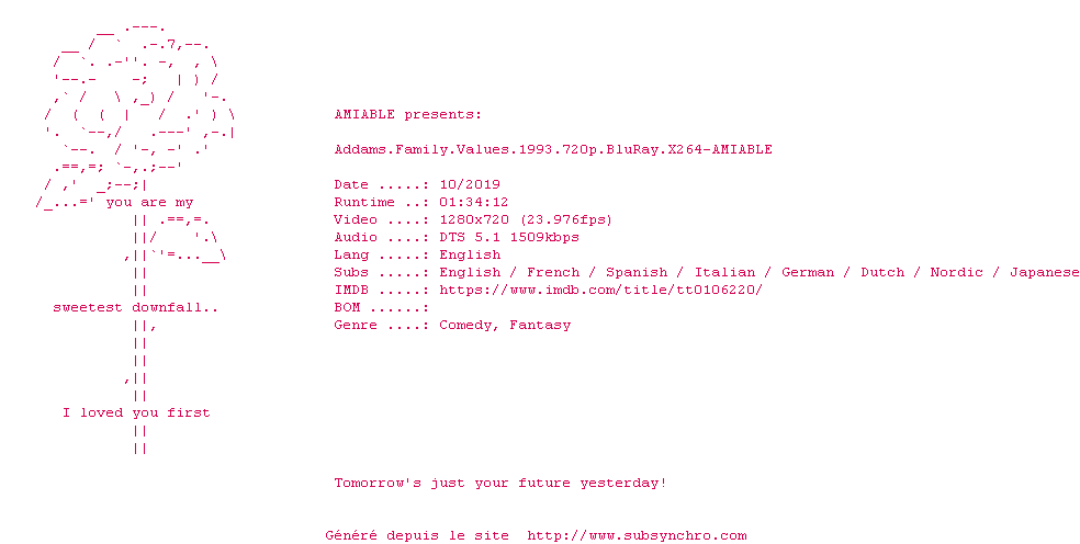 Y avez-vous pense ? Nous proposons déjà 6 sous-titres pour le film Les Valeurs de la famille Addams. Avez-vous essaye de voir si ces sous-titres etaient compatibles avec cette release ? On vous laisse le soin de tester cela pour nous et de contribuer au site en postant le sous-titre en cas de compatiblite constatee !