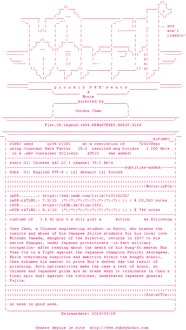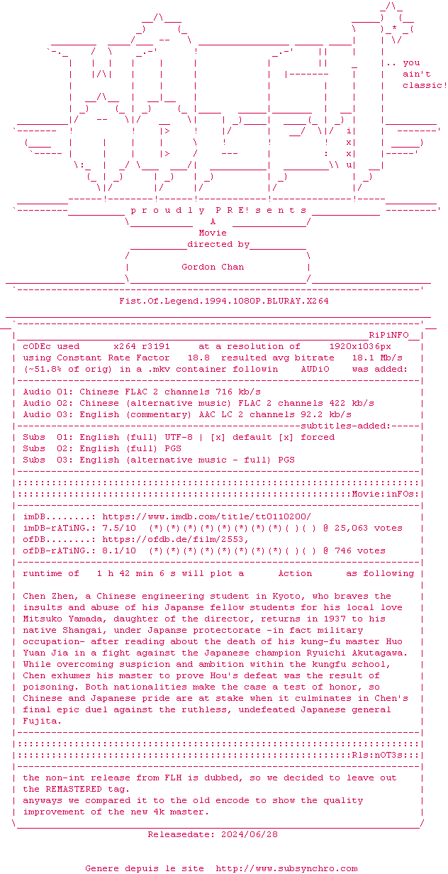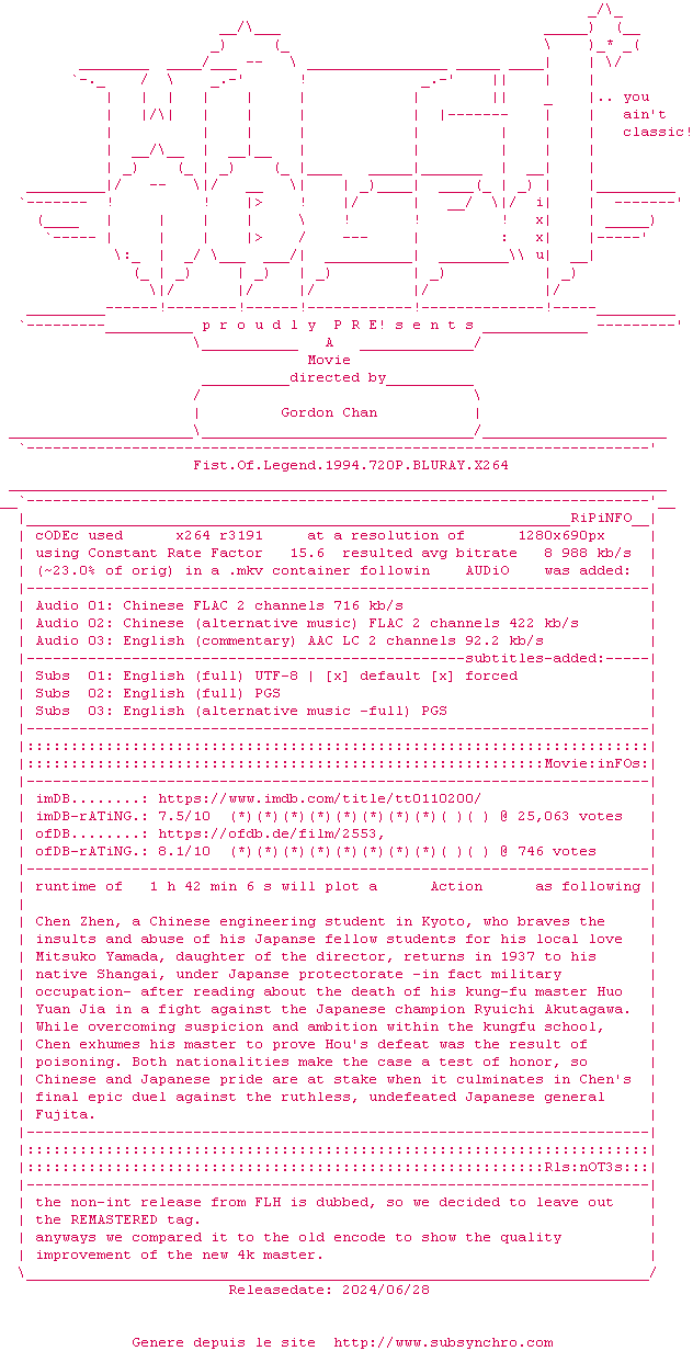 Voir le nfo de la release Jing.Wu.Ying.Xiong.1994.REMASTERED.COMPLETE.BLURAY-FULLBRUTALiTY