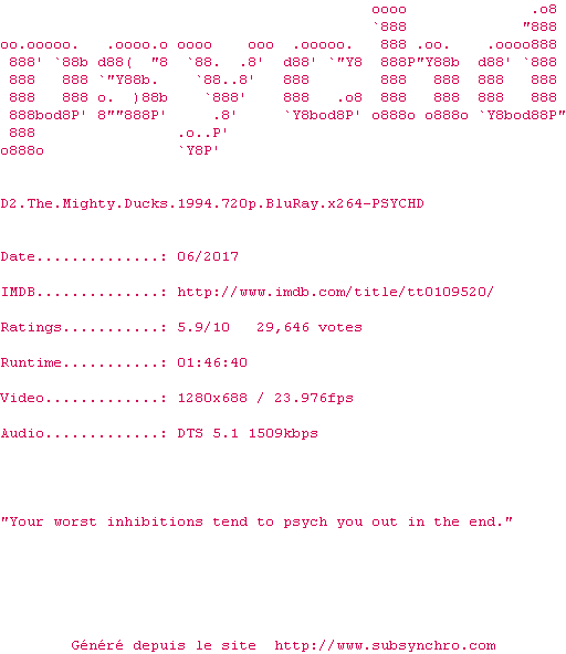 | Voir le nfo de la release D2.The.Mighty.Ducks.1994.720p.BluRay.x264-PSYCHD | PSYCHD | D2.The.Mighty.Ducks.1994.720p.BluRay.x264-PSYCHD OpenSubtitles | 0 fichier | ||