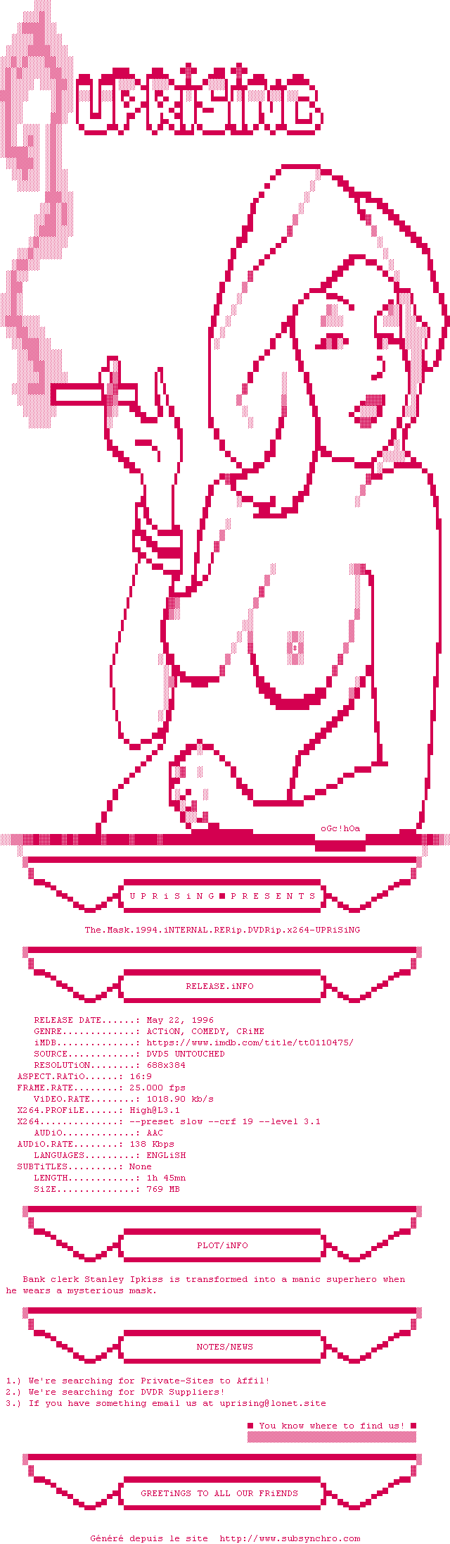 Voir le nfo de la release The.Mask.1994.iNTERNAL.RERip.DVDRip.x264-UPRiSiNG