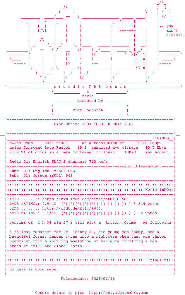 Voir le nfo de la release Lion.Strike.1994.1080P.BLURAY.x264-WATCHABLE