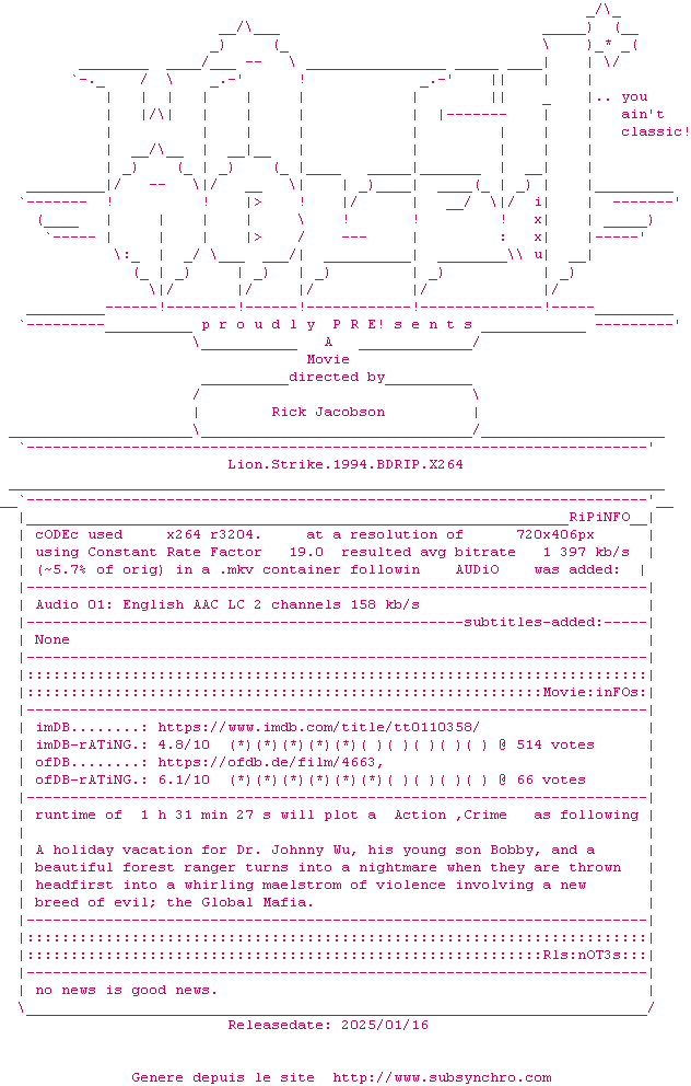 Voir le nfo de la release Lion.Strike.1994.BDRIP.x264-WATCHABLE