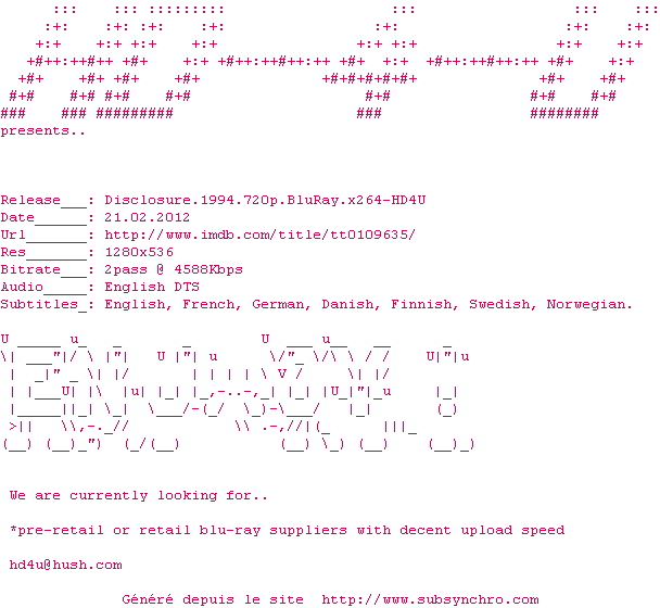 Voir le nfo de la release Disclosure.1994.1080p.BluRay.x264-HD4U