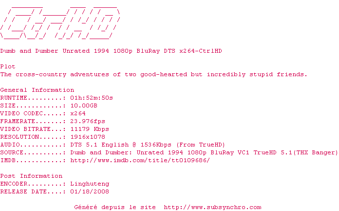 Voir le nfo de la release Dumb.and.Dumber.Unrated.1994.1080p.BluRay.DTS.x264-CtrlHD