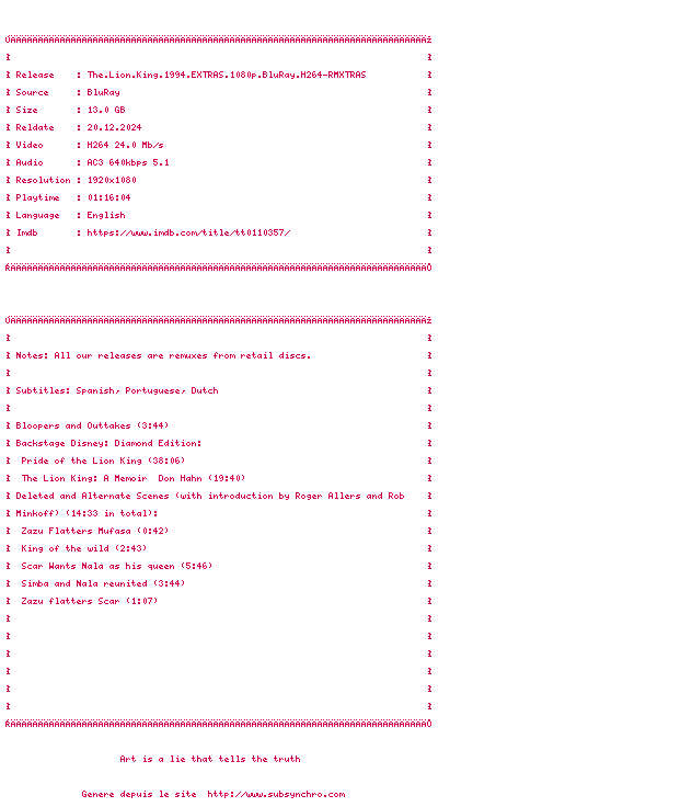 Voir le nfo de la release The.Lion.King.1994.EXTRAS.1080p.BluRay.H264-RMXTRAS
