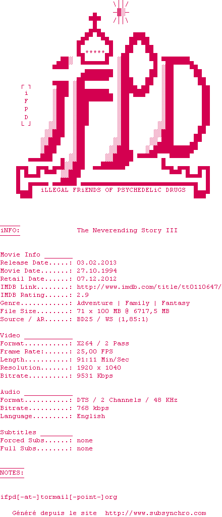 Voir le nfo de la release The.Neverending.Story.III.1994.1080p.BluRay.x264-iFPD