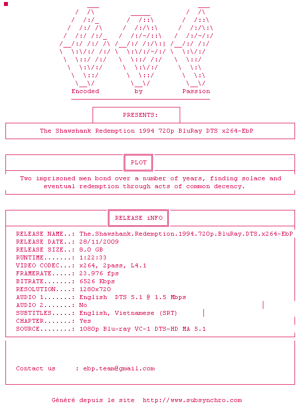 Voir le nfo de la release The.Shawshank.Redemption.1994.720p.BluRay.DTS.x264-EbP EbP The.Shawshank.Redemption.1994.720p.BluRay.DTS.x264-EbP OpenSubtitles 0 fichier