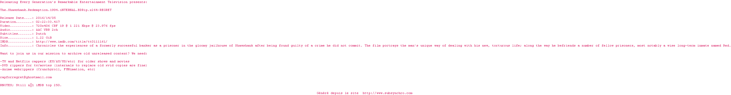 Voir le nfo de la release The.Shawshank.Redemption.1994.720p.BRRip.x264-x0r x0r The.Shawshank.Redemption.1994.720p.BRRip.x264-x0r OpenSubtitles 0 fichier