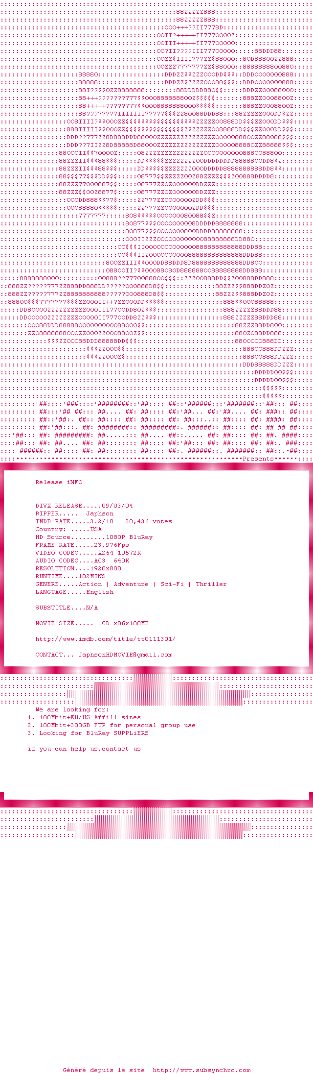 | Voir le nfo de la release Street.Fighter.1994.1080p.Bluray.x264-Japhson | Japhson | Street.Fighter.1994.1080p.Bluray.x264-Japhson OpenSubtitles | 0 fichier |