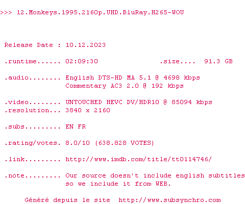 Le commentaire de Yaumegui Commente par Yaumegui (554), Le Jeudi 26 Decembre 2013 à 22h51 Ce n'est pas Brazil, mais on s'y approche. Terry Gilliams maîtrise parfaitement ce thriller écologique de science-fiction aidé en cela par l'excellente performance de Brad Pitt et le jeu classique de Bruce Willis. 9 / 10 1 0