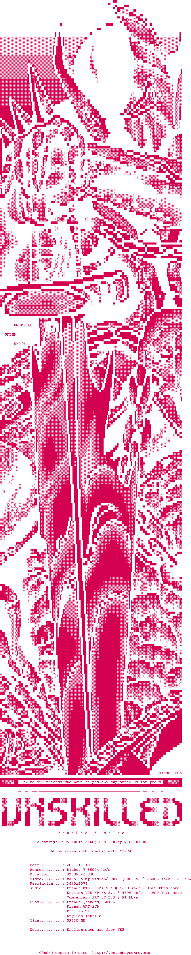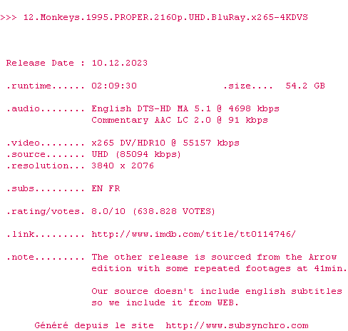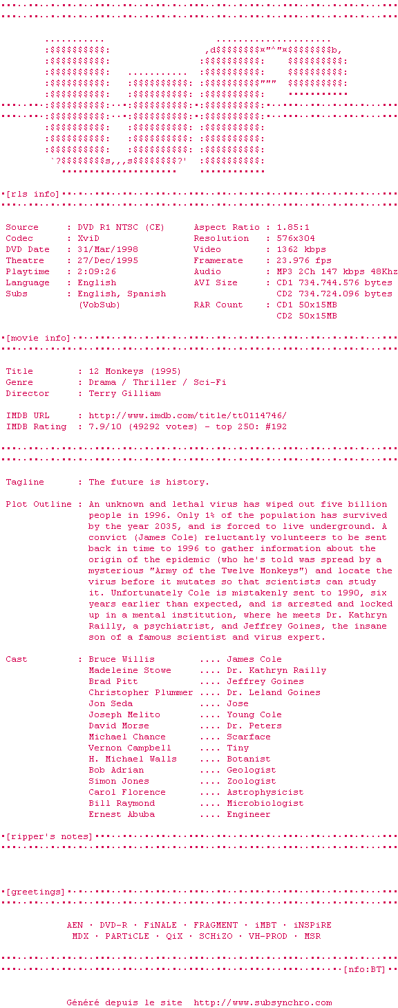 Ce n'est pas Brazil, mais on s'y approche. Terry Gilliams maîtrise parfaitement ce thriller écologique de science-fiction aidé en cela par l'excellente performance de Brad Pitt et le jeu classique de Bruce Willis.