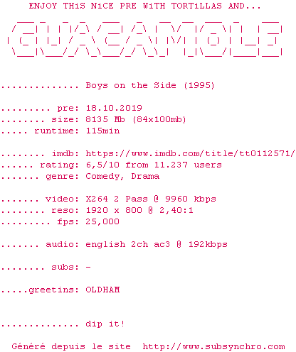 | GUACAMOLE | Boys.On.The.Side.1995.720p.BluRay.x264-GUACAMOLE OpenSubtitles | 0 fichier | |||