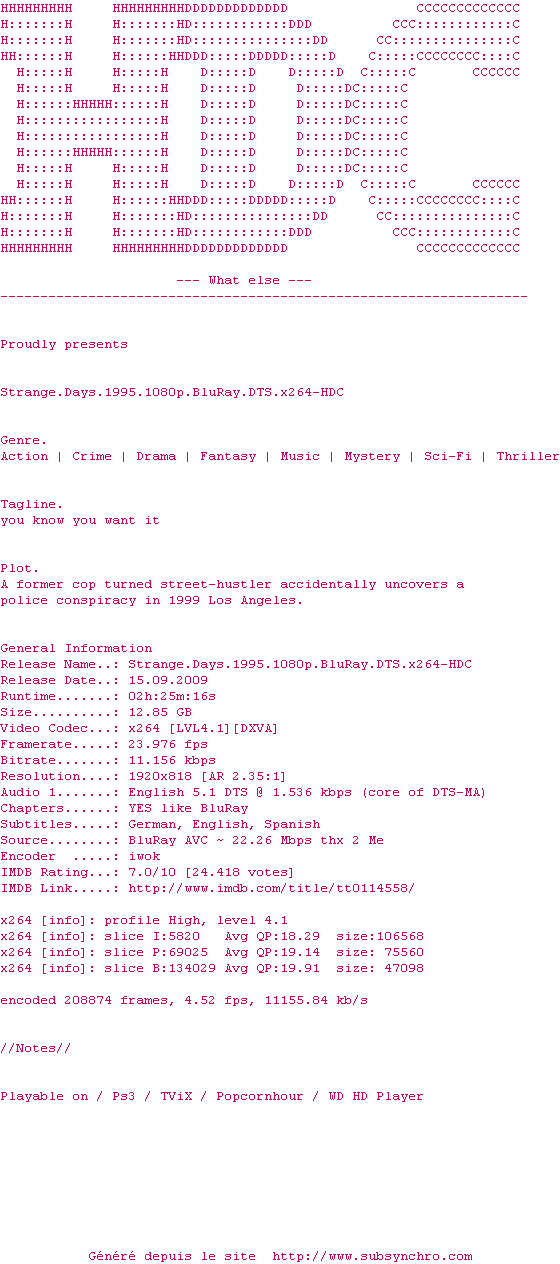 Voir le nfo de la release Strange.Days.1995.1080p.BluRay.DTS.x264-HDC