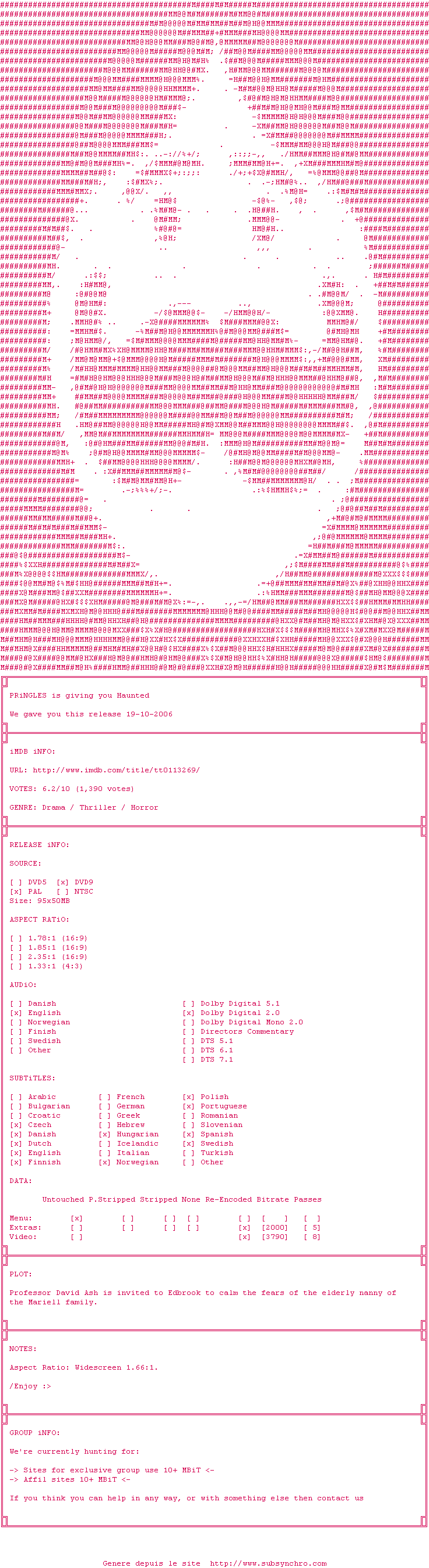 | Voir le nfo de la release Haunted.1995.SE.COMPLETE.MULTISUBS.PAL.DVDR-PRiNGLES | PRiNGLES | Haunted.1995.SE.COMPLETE.MULTISUBS.PAL.DVDR-PRiNGLES OpenSubtitles | 0 fichier |