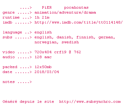 | PFa | Pocahontas.1995.720p.BluRay.x264-PFa OpenSubtitles | 0 fichier | |||