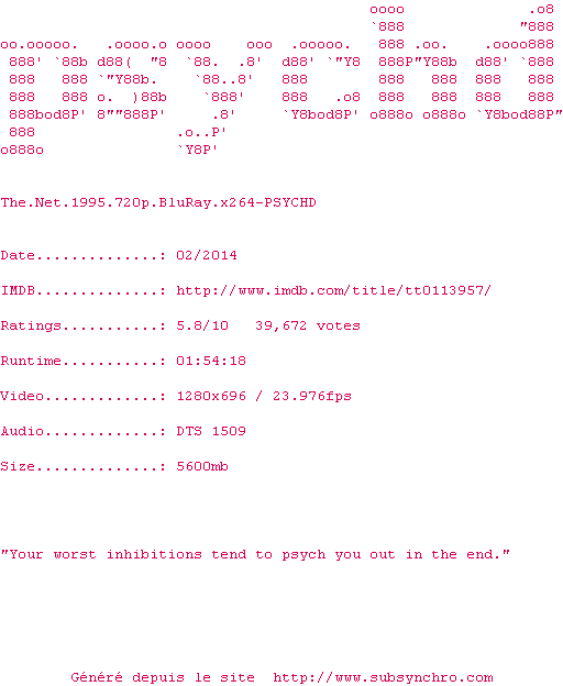 | Voir le nfo de la release The.Net.1995.720p.BluRay.x264-PSYCHD | PSYCHD | The.Net.1995.720p.BluRay.x264-PSYCHD OpenSubtitles | 0 fichier |