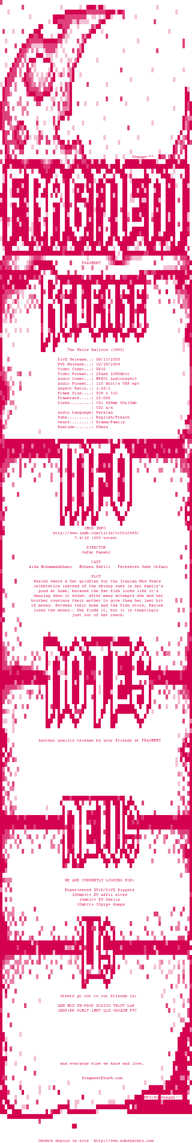 Y avez-vous pense ? Nous proposons déjà 1389 sous-titres pour le film Le Ballon blanc. Avez-vous essaye de voir si ces sous-titres etaient compatibles avec cette release ? On vous laisse le soin de tester cela pour nous et de contribuer au site en postant le sous-titre en cas de compatiblite constatee !