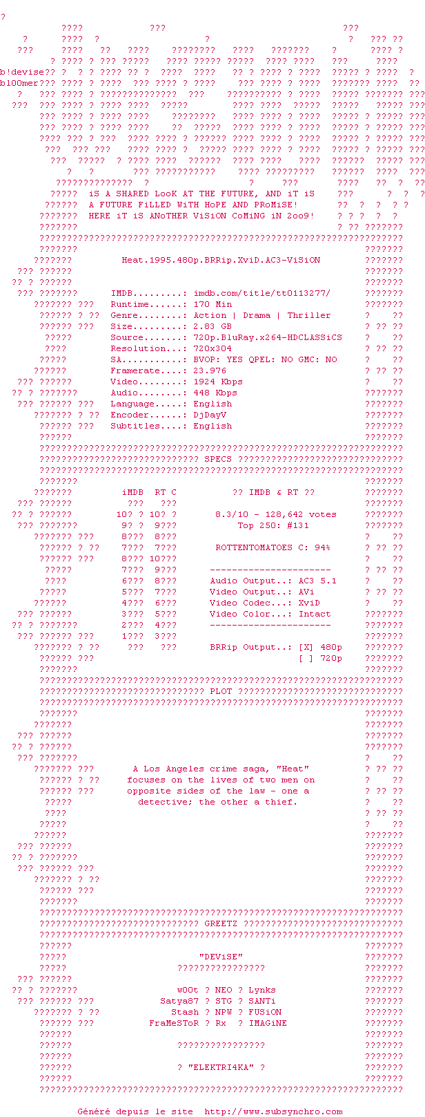 Heat.1995.480p.BRRip.XviD.AC3-ViSiON.srt Ajouté par XeiS Ajoute le 17-01-2010 14:00:11 Format : SRT Italique : Non Taille : 0.00Ko Telechargement : 209 Ajouter cette release à ma collection en cas de telechargement des sous-titres 0 0 0 Telecharger le ZiP contenant NFO, Affiche, Sous-titre (*.srt) Commentez le fichier Heat.1995.480p.BRRip.XviD.AC3-ViSiON.srt Commentez le fichier Heat.1995.480p.BRRip.XviD.AC3-ViSiON.srt Commentez ce fichier Le fichier 52-1263733211.srt n'existe pas ! Telechargez le RSS « Fichier de la release Heat.1995.480p.BRRip.XviD.AC3-ViSiON » Retour au film « Heat »