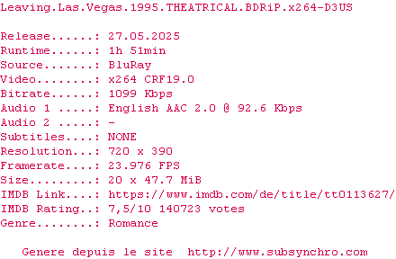 Y avez-vous pense ? Nous proposons déjà 6 sous-titres pour le film Leaving Las Vegas. Avez-vous essaye de voir si ces sous-titres etaient compatibles avec cette release ? On vous laisse le soin de tester cela pour nous et de contribuer au site en postant le sous-titre en cas de compatiblite constatee !