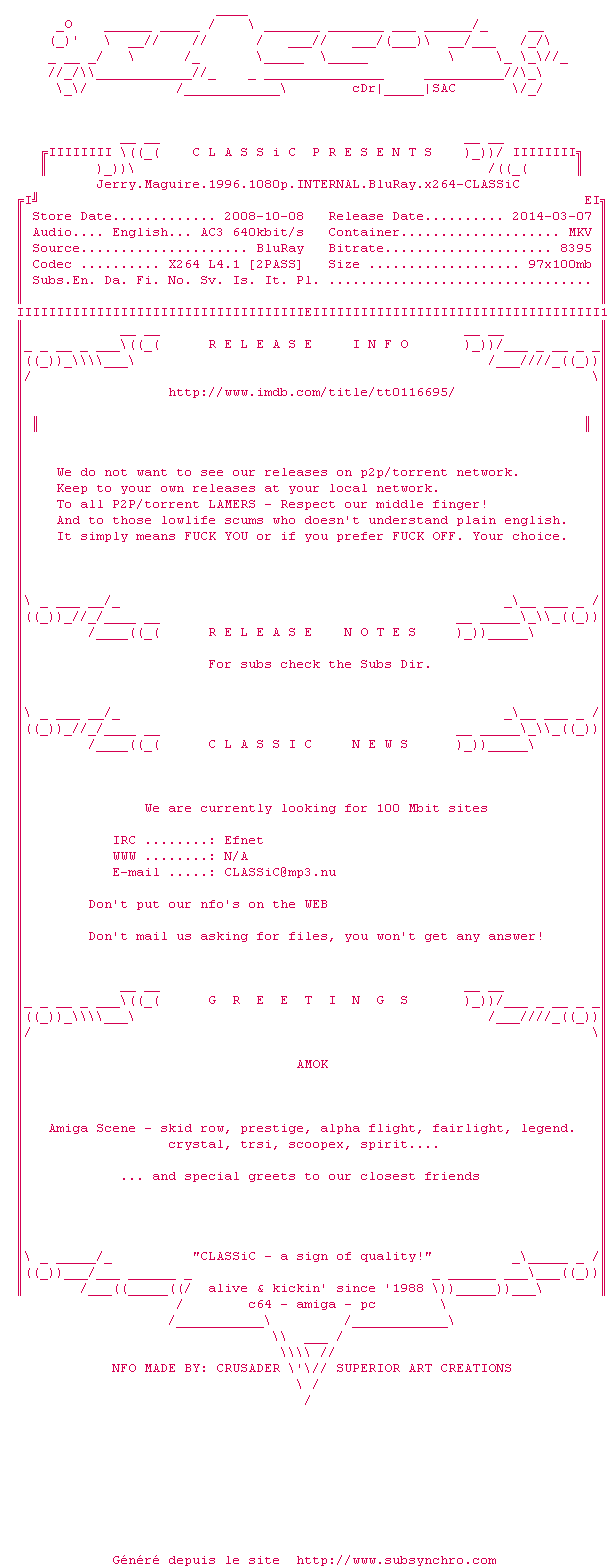 Voir le nfo de la release Jerry.Maguire.1996.1080p.INTERNAL.BluRay.x264-CLASSiC