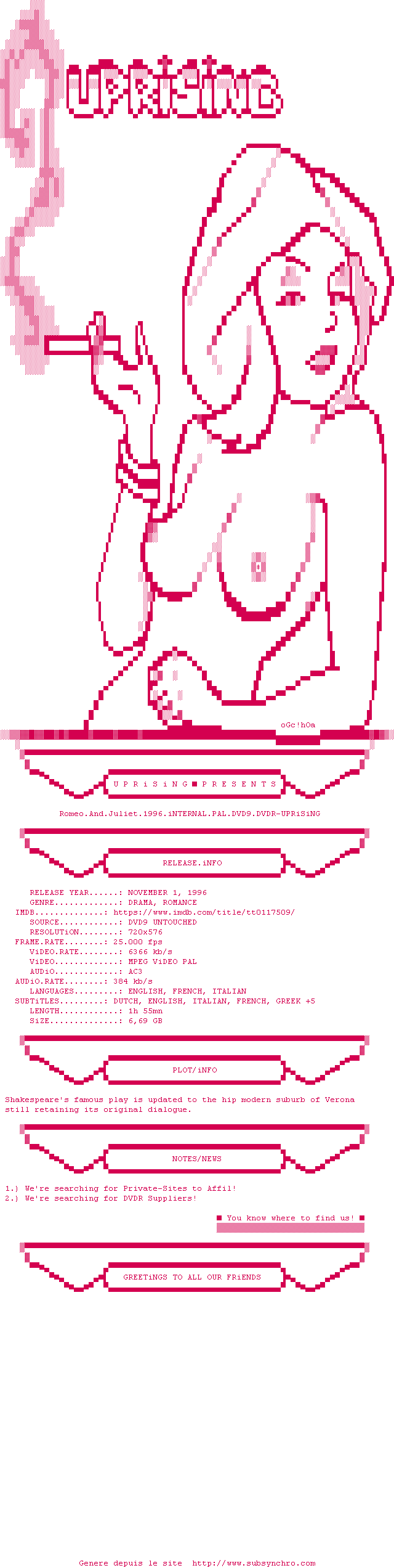 | Voir le nfo de la release Romeo.And.Juliet.1996.iNTERNAL.PAL.DVD9.DVDR-UPRiSiNG | UPRiSiNG | Romeo.And.Juliet.1996.iNTERNAL.PAL.DVD9.DVDR-UPRiSiNG OpenSubtitles | 0 fichier | ||