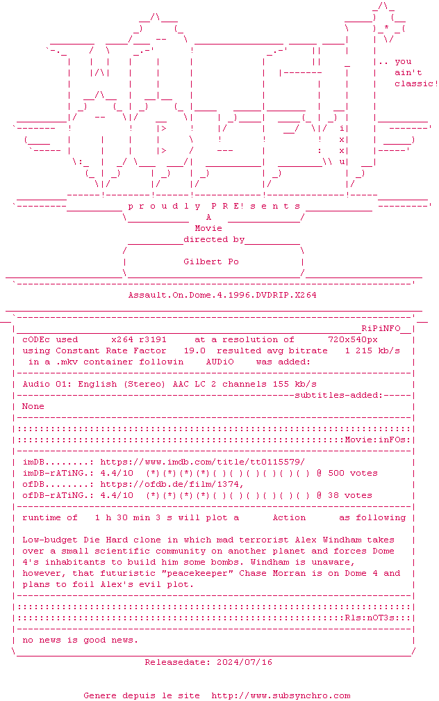 Voir le nfo de la release Assault.On.Dome.4.1996.DVDRIP.x264-WATCHABLE