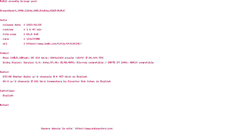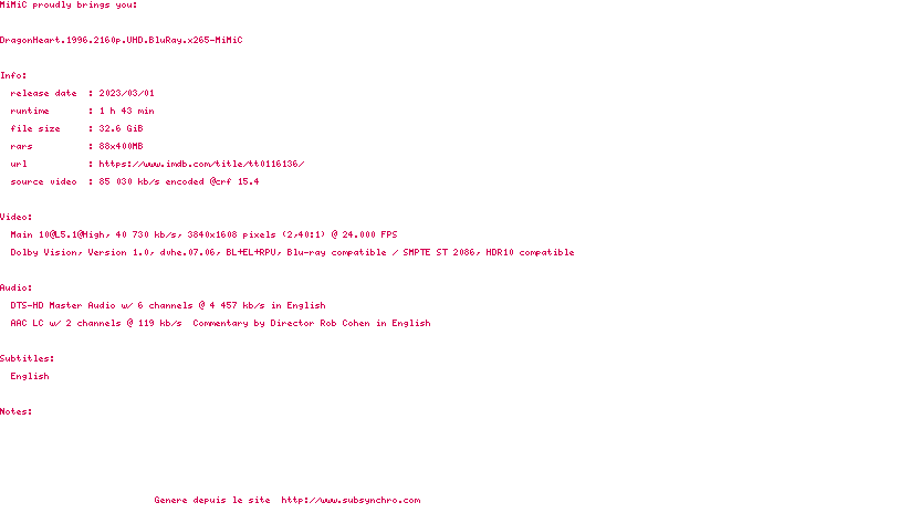 Voir le nfo de la release DragonHeart.1996.2160p.UHD.BluRay.H265-MiMiC