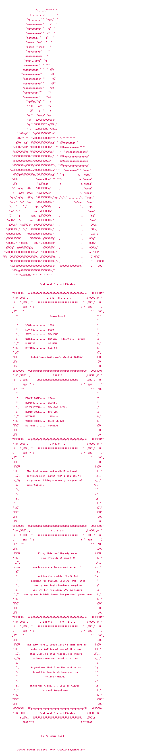 Voir le nfo de la release Dragonheart.1996.WS.DVDRip.XViD.INT-EwDp