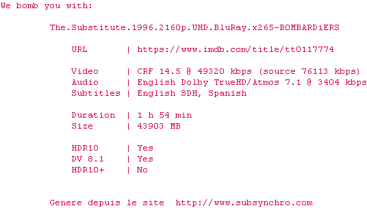 Y avez-vous pense ? Nous proposons déjà 2 sous-titres pour le film The Substitute. Avez-vous essaye de voir si ces sous-titres etaient compatibles avec cette release ? On vous laisse le soin de tester cela pour nous et de contribuer au site en postant le sous-titre en cas de compatiblite constatee !
