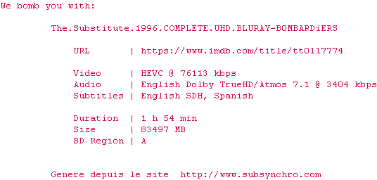 Telechargez le RSS « Fichier de la release The.Substitute.1996.COMPLETE.UHD.BLURAY-B0MBARDiERS »