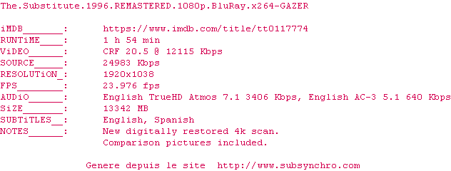 Y avez-vous pense ? Nous proposons déjà 1198 sous-titres pour le film The Substitute. Avez-vous essaye de voir si ces sous-titres etaient compatibles avec cette release ? On vous laisse le soin de tester cela pour nous et de contribuer au site en postant le sous-titre en cas de compatiblite constatee !