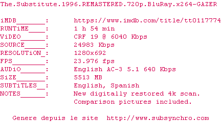 Y avez-vous pense ? Nous proposons déjà 1197 sous-titres pour le film The Substitute. Avez-vous essaye de voir si ces sous-titres etaient compatibles avec cette release ? On vous laisse le soin de tester cela pour nous et de contribuer au site en postant le sous-titre en cas de compatiblite constatee !