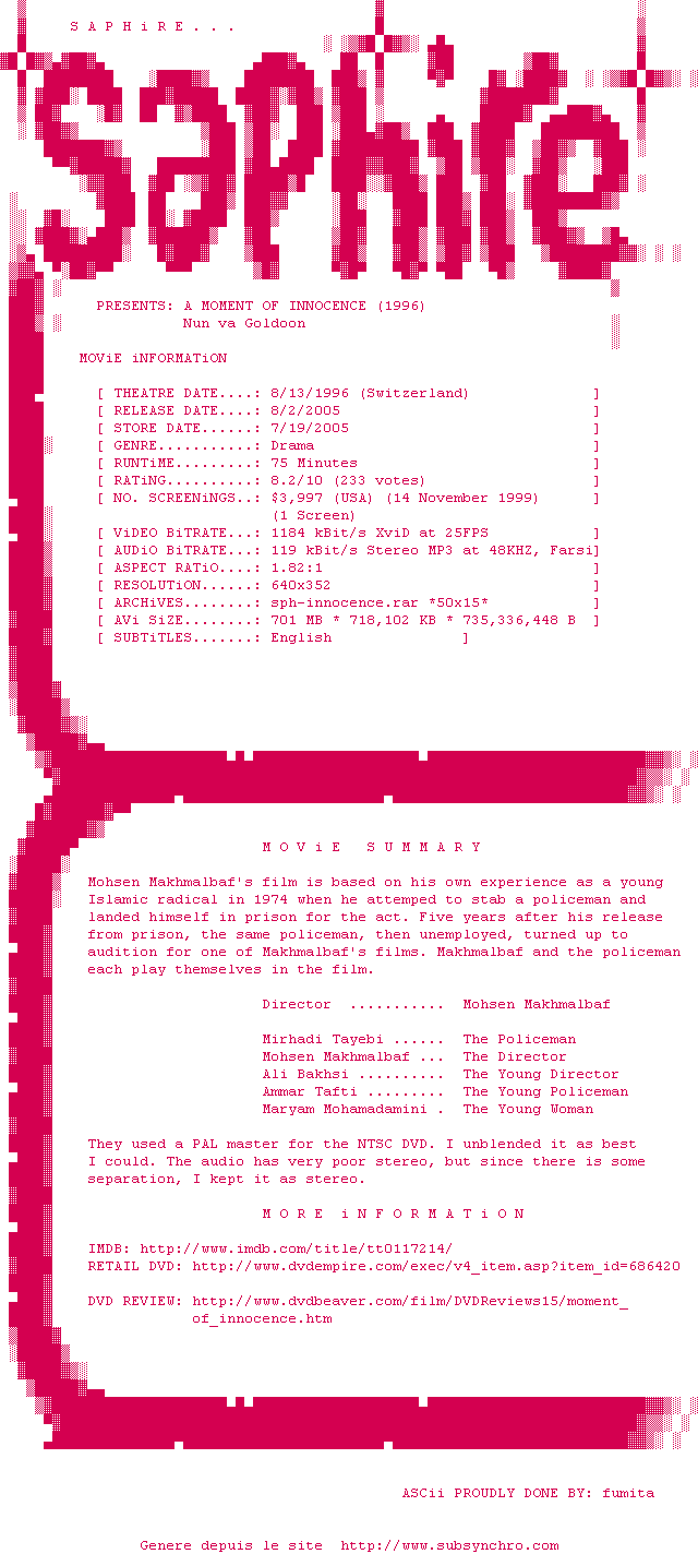 | Voir le nfo de la release A.Moment.Of.Innocence.1996.DVDRip.XviD-SAPHiRE | SAPHiRE | A.Moment.Of.Innocence.1996.DVDRip.XviD-SAPHiRE OpenSubtitles | 0 fichier | ||