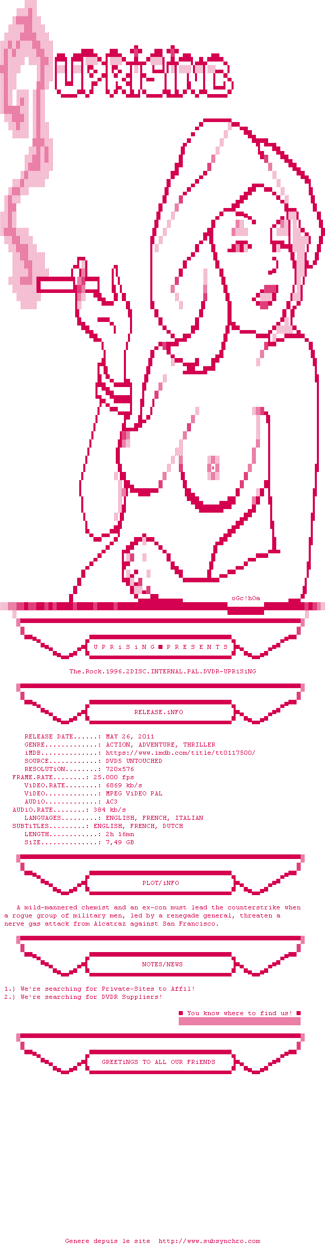 Voir le nfo de la release The.Rock.1996.DISC1.iNTERNAL.DVDRIP.x264-UPRiSiNG