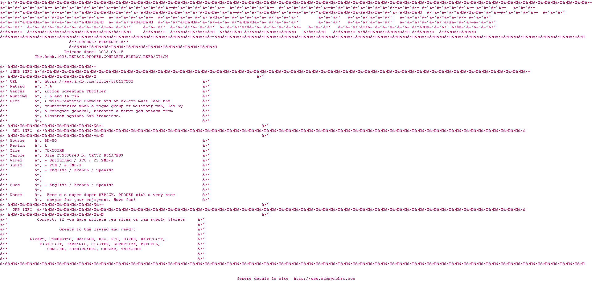 Voir le nfo de la release The.Rock.1996.REPACK.PROPER.COMPLETE.BLURAY-REFRACTiON